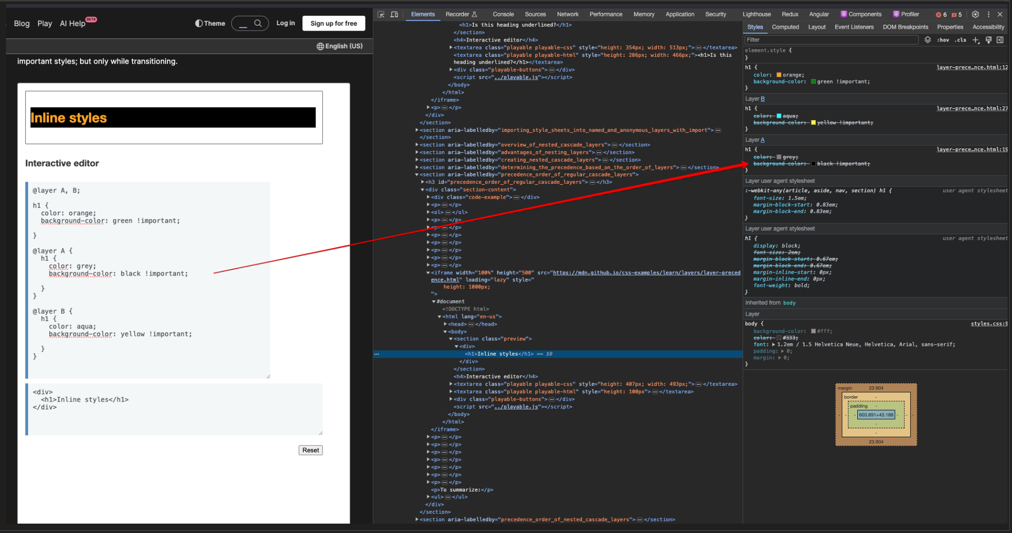 Important declarations invert the precedence of current css rules, so the first !important declaration in an @layer will take precedence over css outside the layer and those after (botov2’s in the demo layer in our case, since that’s the declaration that’s supposed to have the least precedence).