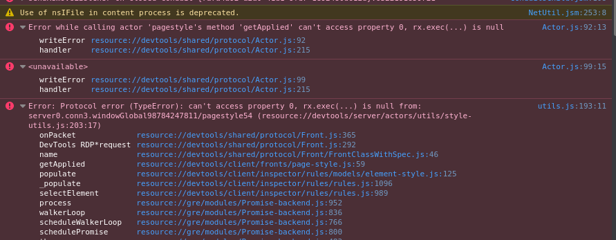 I’m seeing this in the Firefox Desktop remote debugging console when I select an element in the inspector: